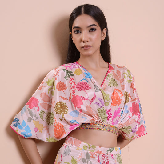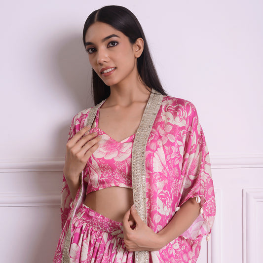 HOK ENSEMBLE- printed pink Silk skirt with cape and blouse