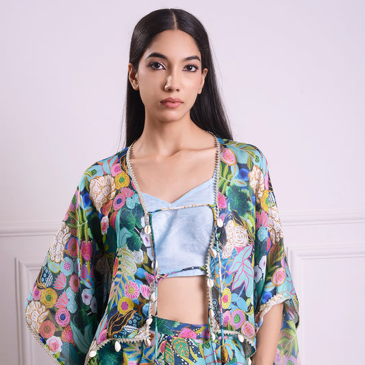 HOK ENSEMBLE Aquamarine Georgette satin skirt with kaftan style top with blouse