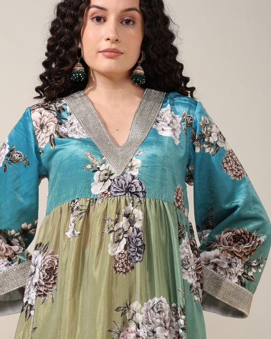 HOK ENSEMBLE - Printed Sea Green floral Velvet Suit set
