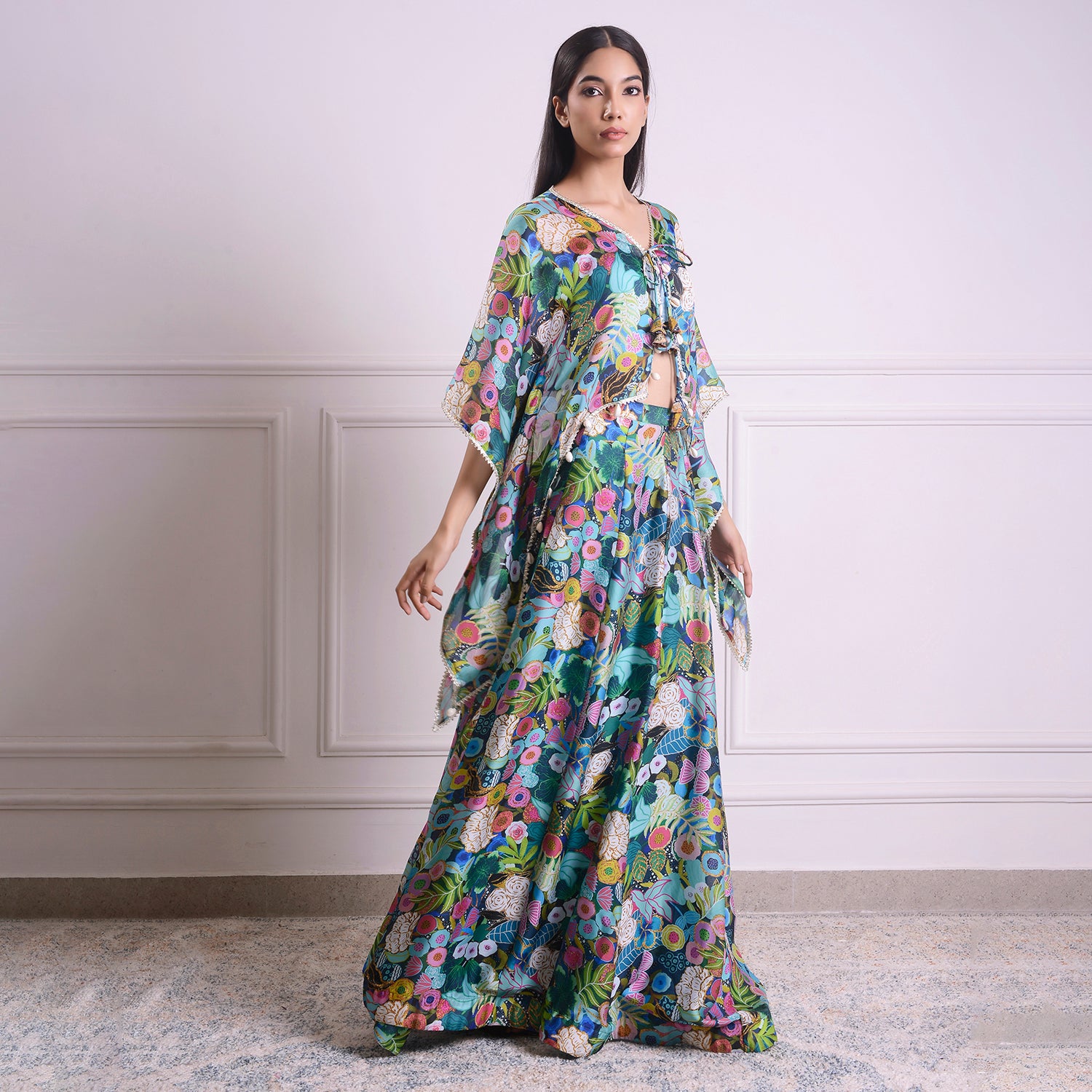 Multi Colour short kaftan featuring all over floral print with embellishments lined with cowrie shells. Comes with inner bustier and attached flared lehenga.