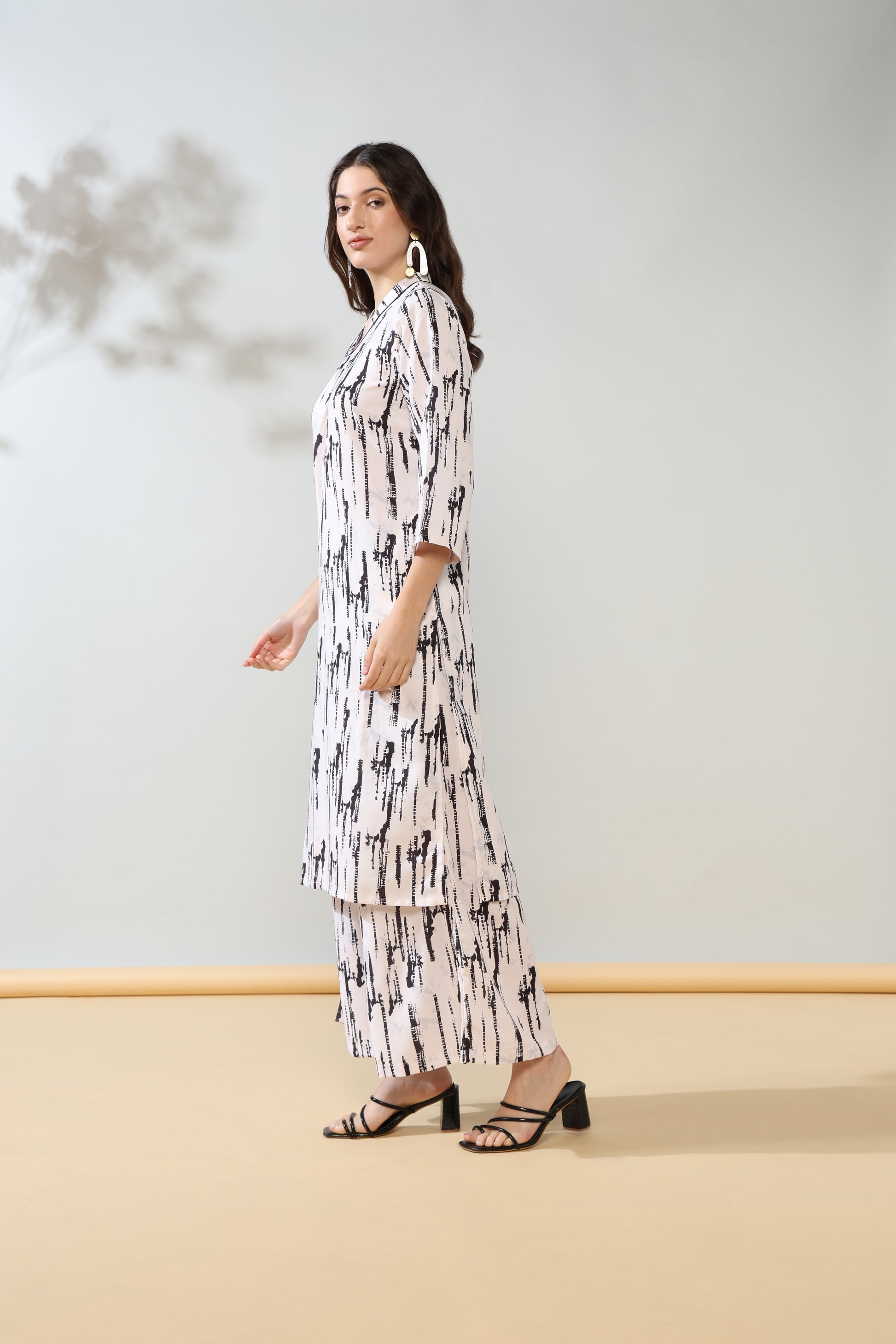 Tropical teal motifs and soothing prints make this co-ord Suit set ideal for vacation and casual brunches.